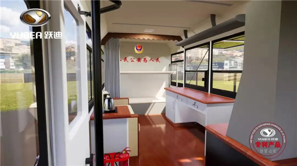 躍迪移動警務室是根據民警基層單位實際工作需求研制而成,具有超大的工作空間。該車除裝備有計算機、監控器、飲水機、LED顯示屏等基礎設施外,還可以根據用戶需求配備單警裝備和警用器材等設備。