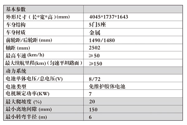 整體車身采用鋼板沖壓成型,車身經陰極電泳處理。具有語音裝置,運用蓄電池,是一款節能環保、低噪音、零排放的綠色執法用車。