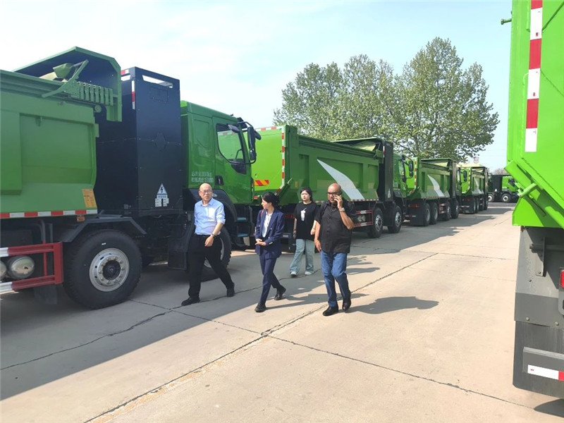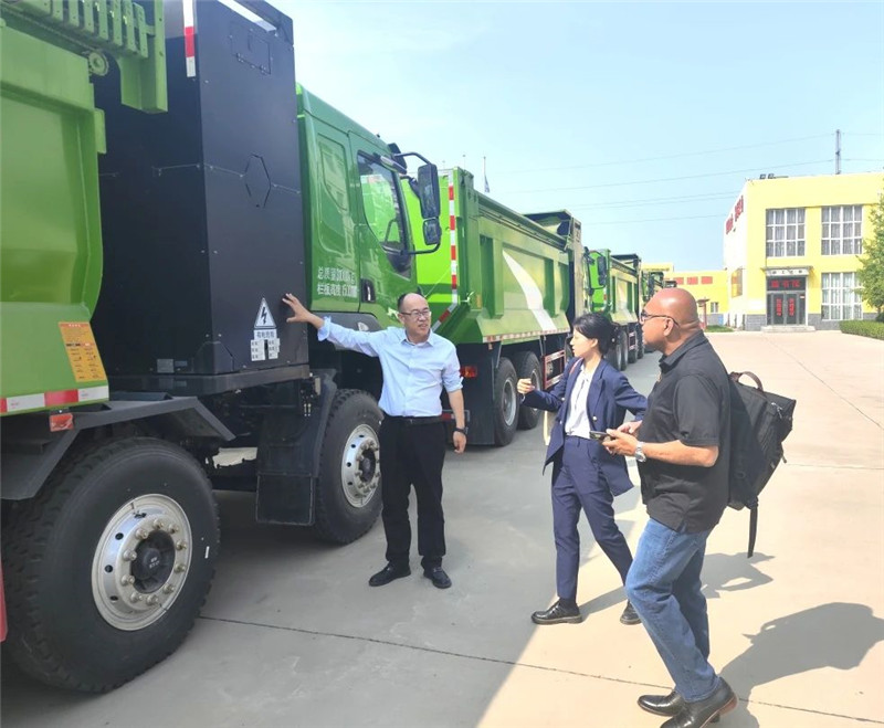 躍迪集團副總裁崔清學向美國客商Tony Joseph介紹了躍迪集團自主研發的躍迪純電動渣土自卸車。
