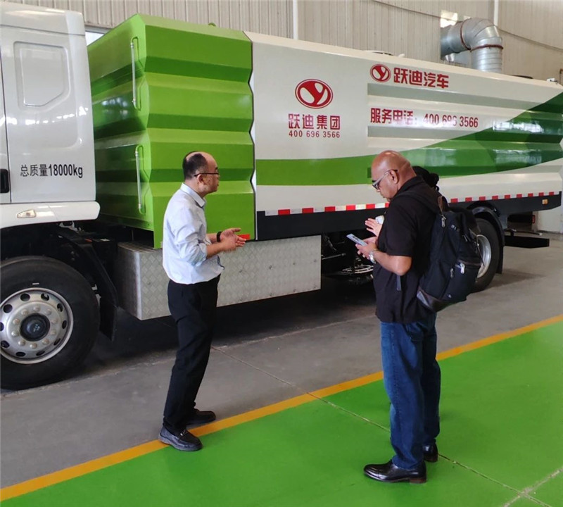 躍迪集團副總裁崔清學向美國客商Tony Joseph介紹了躍迪集團自主研發的躍迪純電動洗掃車。